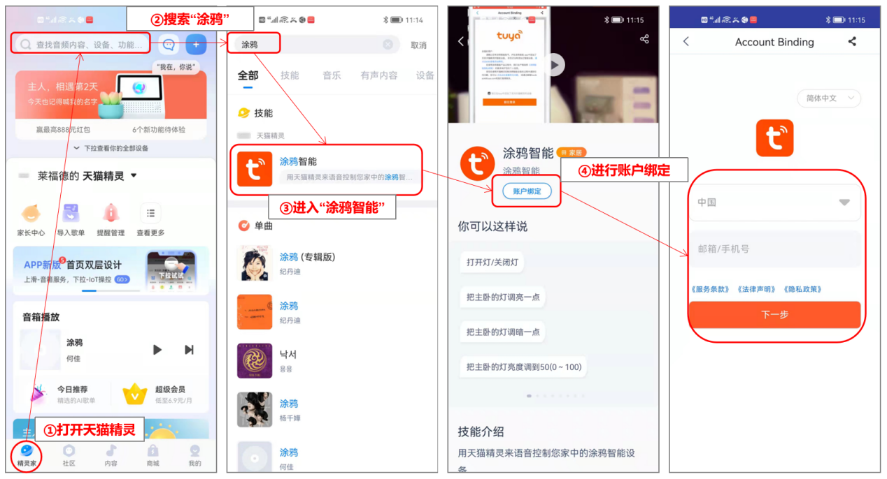 第三步:在智能音響控制App中授權涂鴉賬號,以天貓精靈為例:打開天貓精靈,搜索涂鴉,點擊搜索結果進入涂鴉授權界面即可完成授權并開始使用語音控制了。