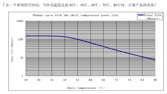 這里,細(xì)心的小伙伴可能注意到了小編對于質(zhì)保有這么一句描述“按照萊福德產(chǎn)品規(guī)格書指導(dǎo),正確應(yīng)用在產(chǎn)品工作環(huán)境內(nèi)”。為什么要有該要求呢?以某產(chǎn)品壽命曲線舉例,可以看到不同殼溫下產(chǎn)品壽命可相差非常大,故一般電子產(chǎn)品的質(zhì)保壽命都會對使用環(huán)境溫度及產(chǎn)品殼溫做出一定規(guī)范。