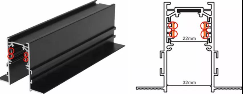 四線導軌內部為三火一零4條導電線,也就是同一導軌上可以分3個回路的控制,在安裝時配合有檔位調節功能的四線導軌燈,即可實現不同場景分控需求。