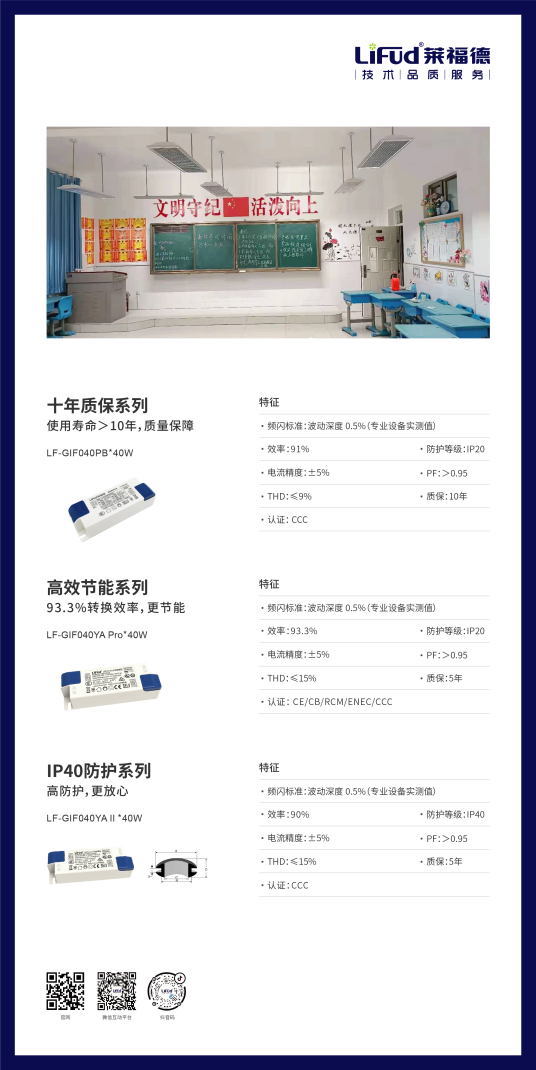 常規教室照明十年質保LF-GIF040PB系列、高效節能LF-GIF040YA Pro系列、IP40防護LF-GIF040YAII系列;智慧教室LF-GSZ040PC系列。2021年助力河南、山東、浙江、廣東、四川等十余座城市,近萬間教室照明改造,其中包括綿陽1000+智慧教室照明改造。