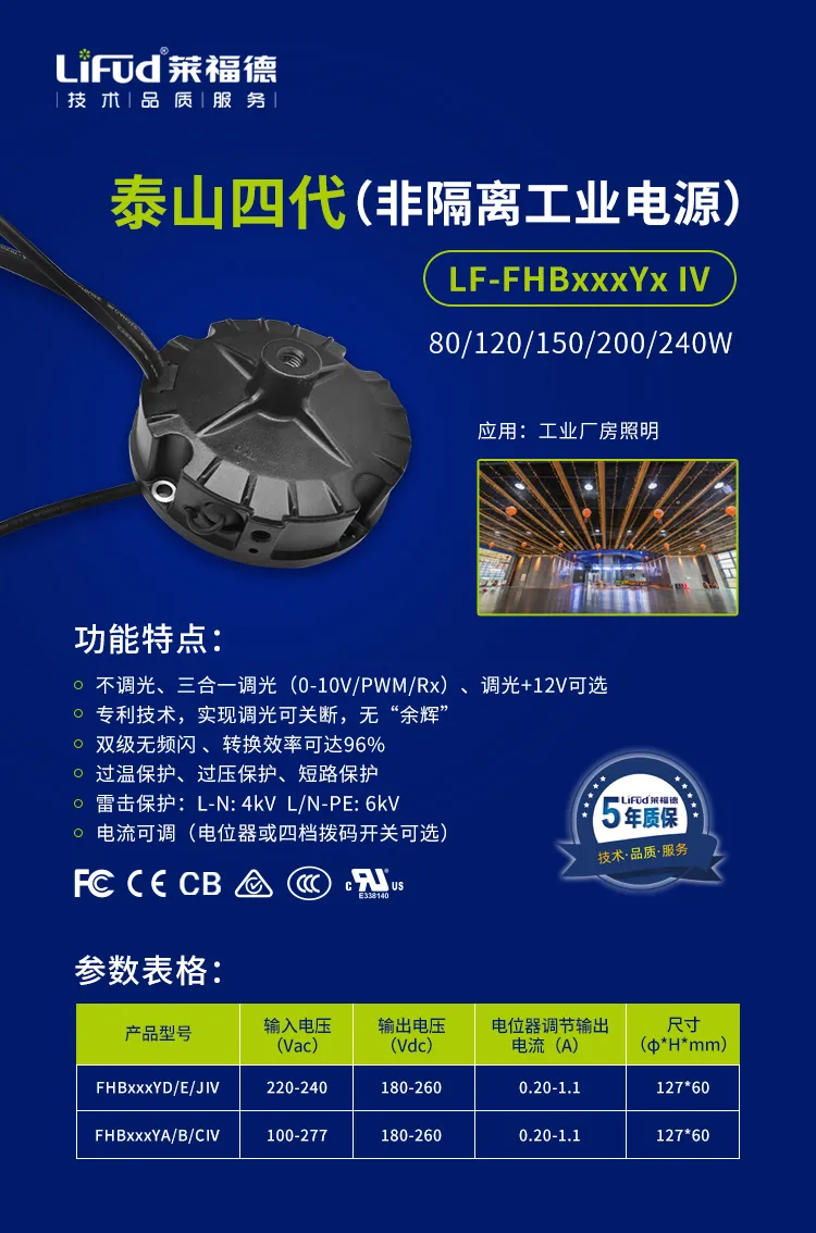 非隔離UFO系列LF-FHBxxxYx IV,工業照明專用電源,四代升級實現調光關斷無余輝,預留12V輔助供電可外接智能模塊秒變智能調光電源,如福星科技一分廠打造的藍牙控制系統。