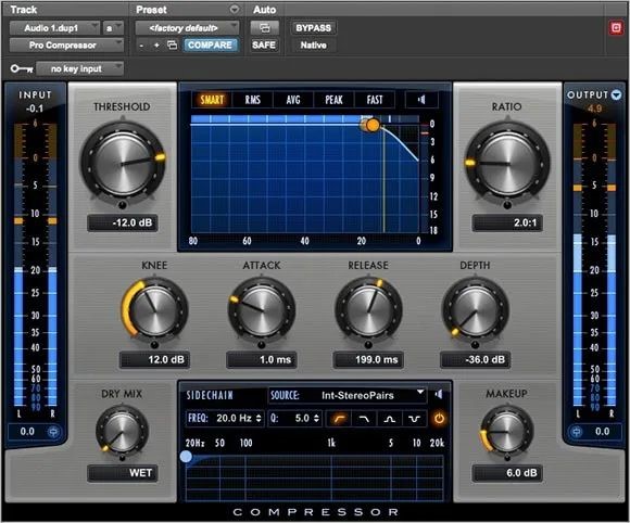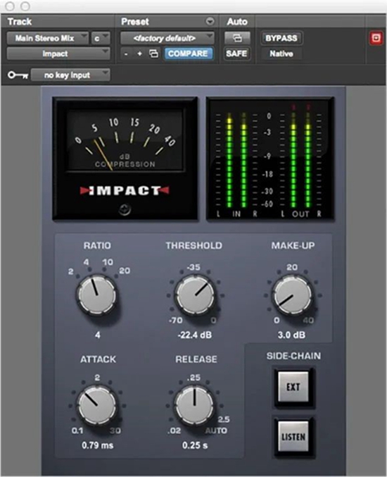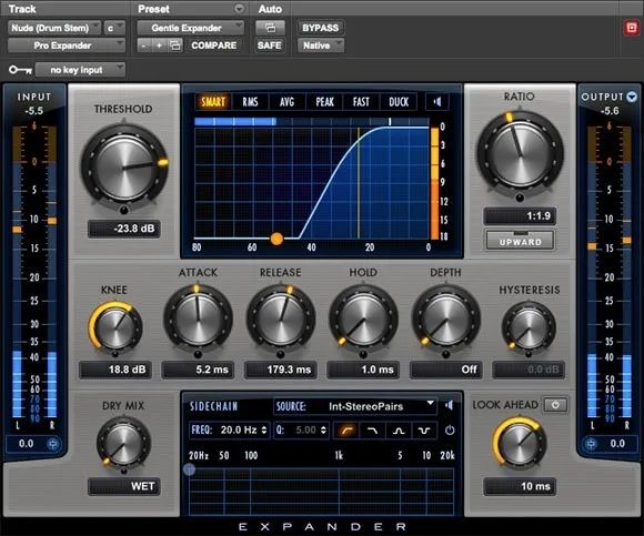 平均檢測器通過計算平均響度來均衡聲音,峰值檢測器根據設定的閾值優化聲音,快速峰值檢測器使用更快的起音和釋音時間來平滑瞬變重的軌道(如鼓),RMS檢測器使用這種強大的“全方面”增強器/優化器來改善軌道 - 智能模式(默認)快速賦予軌道生命,壓縮軌道而不失真或跳動