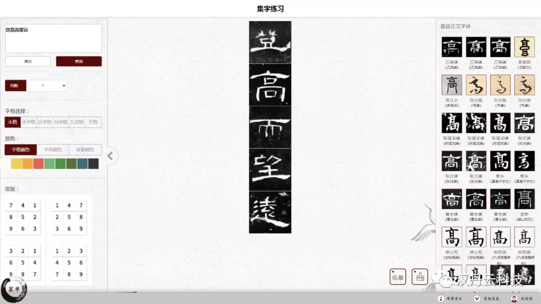 漢丹云智慧書(shū)法教室軟件能夠根據(jù)用戶(hù)需求,任意選調(diào)《曹全碑》中的例字,并將其按照需要的版式,1-16字選擇排版,當(dāng)場(chǎng)形成書(shū)寫(xiě)字帖,在桌面電腦上可觀賞可臨寫(xiě)可描摹十分方便!