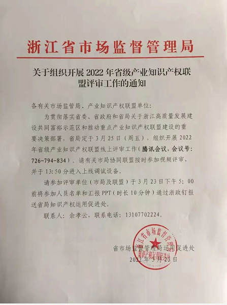為貫徹落實省委、省政府和省知識產(chǎn)權(quán)局關(guān)于浙江高質(zhì)量發(fā)展建設(shè)共同富裕示范區(qū)和推動重點產(chǎn)業(yè)知識產(chǎn)權(quán)聯(lián)盟建設(shè)的重要決策部署,省知識產(chǎn)權(quán)局于2022年3月25日(周五)下午,組織召開2022年省級產(chǎn)業(yè)知識產(chǎn)權(quán)聯(lián)盟線上評審會。浙江教育裝備產(chǎn)業(yè)知識產(chǎn)權(quán)聯(lián)盟、浙江醫(yī)療器械知識產(chǎn)權(quán)聯(lián)盟等14家聯(lián)盟被推薦參加本次省級備案專家評審會。本次評審會由省知識產(chǎn)權(quán)局運用促進處處長沈方英主持。
