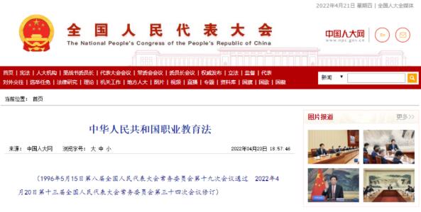 2022年4月20日第十三屆全國人民代表大會常務委員會第三十四次會議修訂,并表決通過新修訂的職業教育法,2022年5月1日起施行,這是職業教育法制定近26年來的首次修訂。