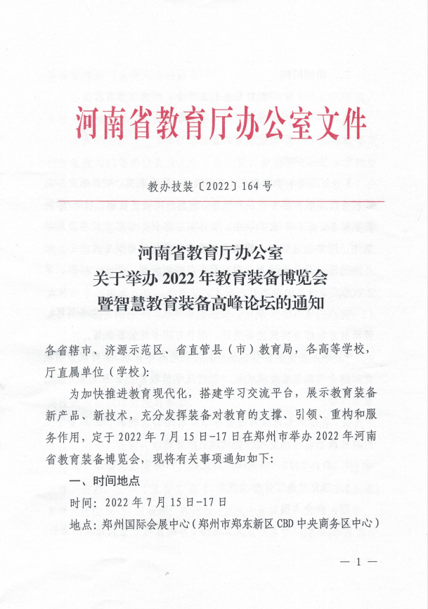 河南省教育廳辦公室關(guān)于舉辦2022年教育裝備博覽會暨智慧教育裝備高峰論壇的通知
