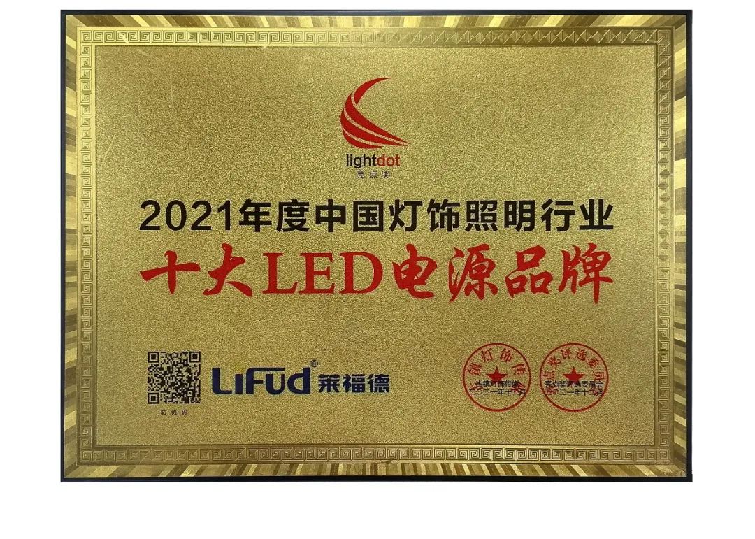 恭喜萊福德榮獲“中國(guó)燈飾照明行業(yè)十大LED電源品牌”獎(jiǎng)