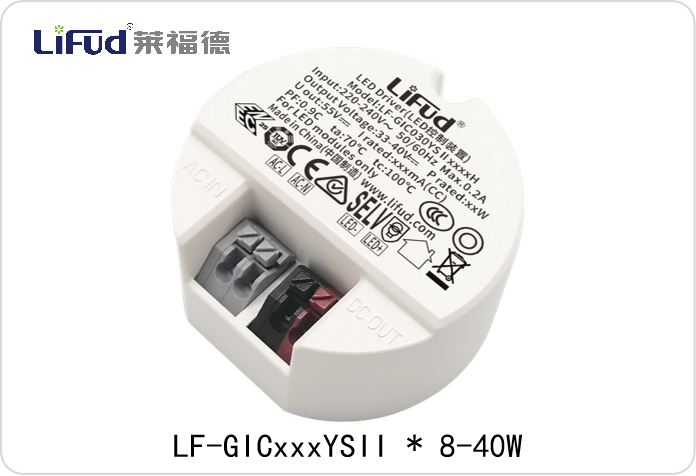 LF-GICxxxYS II(8-40W)為灌膠設計,可應用在Ta70℃,Tc90℃的環境下(常用于燈腔內置),輸入電壓范圍220-240Vac,輸出功率8-40W,滿足市面大多數導軌筒射燈應用需求。