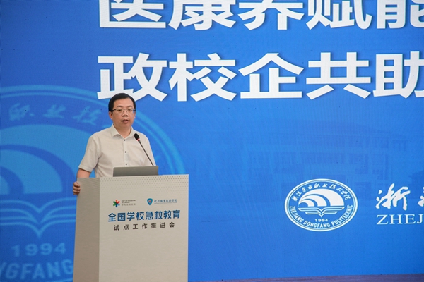 7月25日,全國學(xué)校急救教育試點(diǎn)工作推進(jìn)會在杭州職業(yè)技術(shù)學(xué)院舉行。教育部體育衛(wèi)生與藝術(shù)教育司體育與衛(wèi)生教育處副處長樊澤民,中國教育裝備行業(yè)協(xié)會常務(wù)副會長夏國明,浙江省教育廳體衛(wèi)藝處處長李建章,浙江省紅十字會黨組成員、專職副會長黃元龍,杭州市教育局黨委委員、副局長高寧,杭州市紅十字會黨組成員、二級巡視員譚湘,全國校園急救教育試點(diǎn)工作辦公室副主任李夢瑩、王艷,杭州職業(yè)技術(shù)學(xué)院校長徐時(shí)清、副校長樓曉春以及浙江省各試點(diǎn)學(xué)校相關(guān)負(fù)責(zé)人出席會議。會議以線上線下相結(jié)合形式召開,并覆蓋全國各試點(diǎn)校。