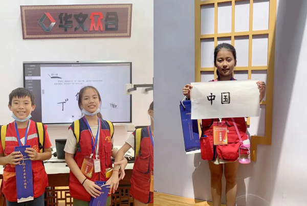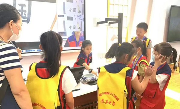 華文眾合工作人員向南寧晚報小記者們介紹第八代智慧書法教室