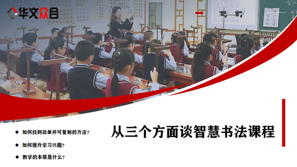 打造高質(zhì)量課后服務(wù),需要充分利用社會資源。研討會上,華文眾合董事長向大鳳從“學(xué)習(xí)方法”“學(xué)習(xí)興趣”“教學(xué)本質(zhì)”三個方面簡要介紹了“華文眾合智慧書法課程”。自成立起,華文眾合一直致力于書法藝術(shù)教學(xué)軟硬件產(chǎn)品的研發(fā)、生產(chǎn)和推廣,助力打造課后服務(wù)優(yōu)質(zhì)課程。