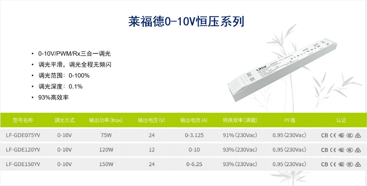 LF-GADxxx系列是萊福德最新上市的一款五合一調光恒壓產品,其優異的調光效果、93%超高轉換效率、0.1%調光深度及全系列認證,讓該產品可應用在各大高端項目,且擁有40W、240W兩個功率型號,進一步完善了萊福德DALI&0-10V產品系列。
