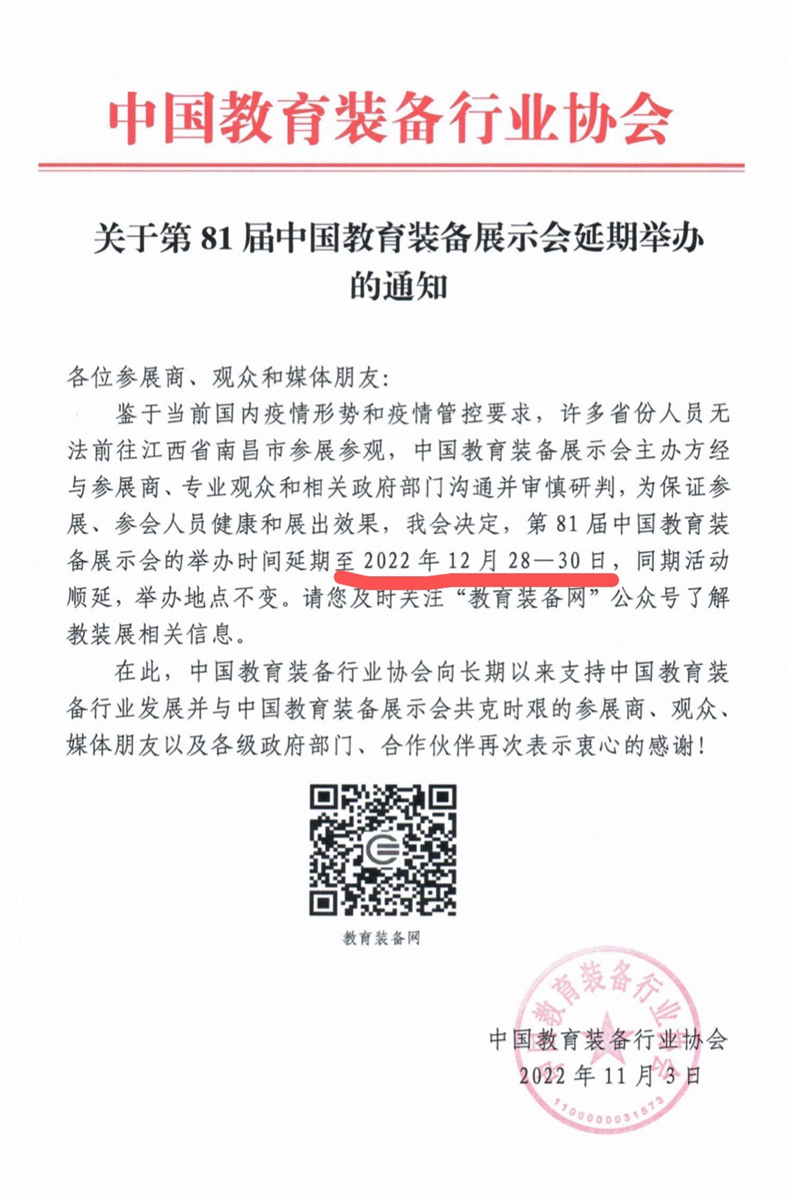 受疫情影響,昨日中教協(xié)發(fā)函通知,原定于2022年11月18-20日舉辦的第81屆中國教育裝備展示會,延期至2022年12月28-30日!由此給您造成的不便,我們也深感抱歉,期待與您再次相約!