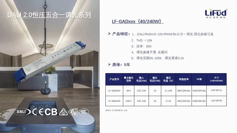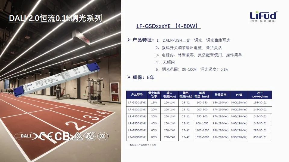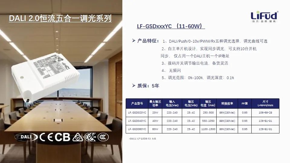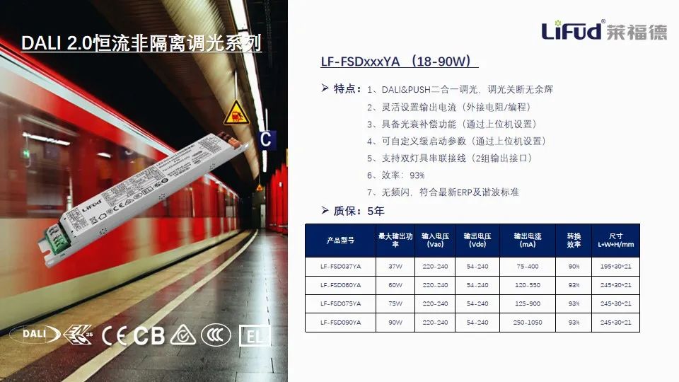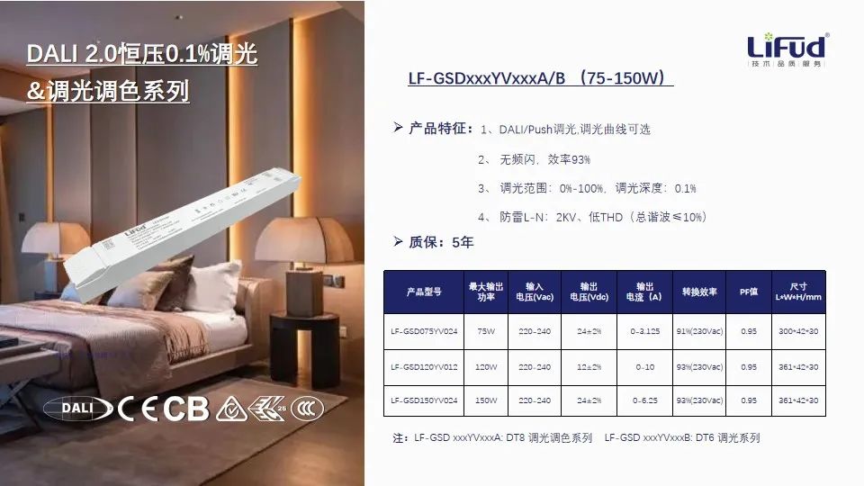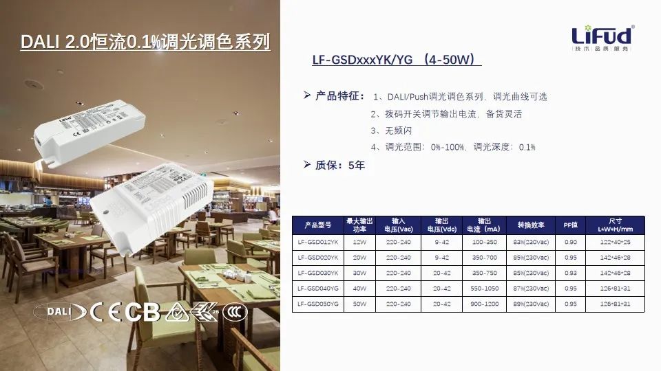 針對恒壓燈帶、燈箱及其他裝飾照明應用,萊福德DALI擁有二合一(DALI/PUSH)調光&調光調色、五合一(DALI/PUSH/0-10V/Rx/PWM)調光兩大系列,其最高效率都可達到93%,遠超市面同類產品,助力燈具高效節能。