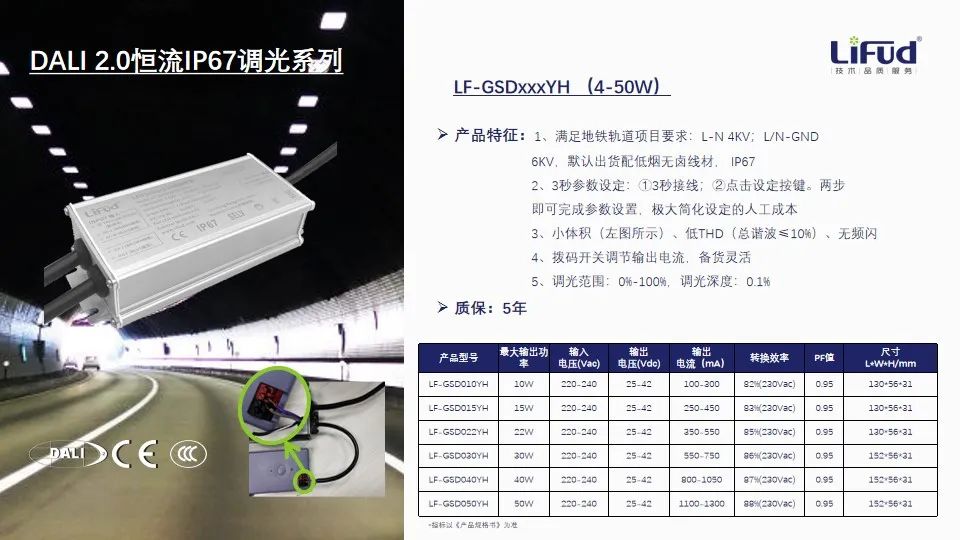 而LF-GSDxxxYC系列也憑借10臺同步并機調光功能,助力減少主機系統應用而成為大型項目寵兒。IP67系列則針對隧道、地鐵、戶外照明應用開發,助力燈具在潮濕的環境下穩定運行,長期應用。