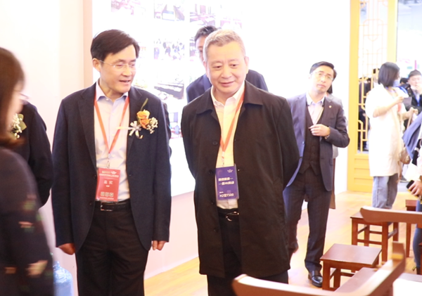上海市教育委員會副主任王浩(左)、上海教育裝備行業協會會長竺建偉(右)參觀指導華文眾合展位
