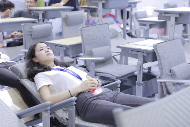 在研發時充分考慮到對教室空間的利用率,在課桌椅椅腳后部設計了獨有的穩固腳,可實現前后桌椅穿插放置,達成不多占用教室空間的目的,并且讓平躺午休更加安全。在教室內擺放時,平均縱深長度不到一米,而且從座椅轉換成躺椅形態時,也不需要向外擴展空間,滿足多人教室和小面積教室的現實改造。