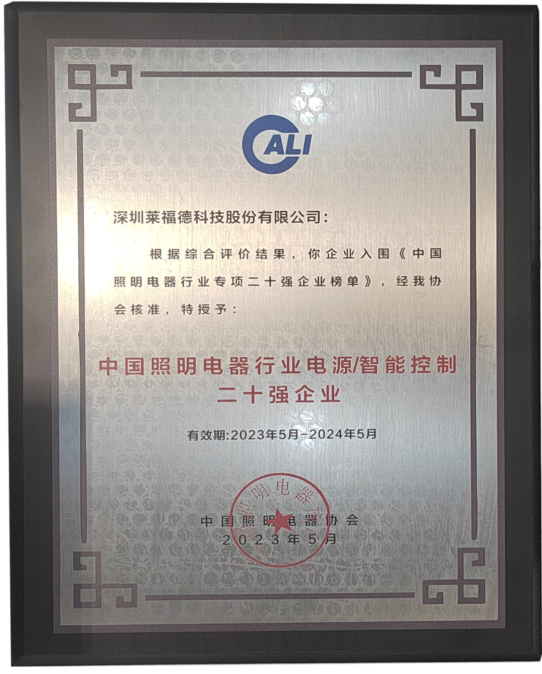 從企業(yè)整體實力、到萊福德品牌、再到細(xì)分領(lǐng)域;從技術(shù)研發(fā)創(chuàng)新,到細(xì)分產(chǎn)品落地,萊福德始終以專精的態(tài)度對待每一個市場,深入分析不同照明應(yīng)用的痛點,讓每一款產(chǎn)品成為各自領(lǐng)域的“專家”,正是萊福德的這份專注,讓萊福德在智能控制領(lǐng)域再次脫穎而出,榮獲“電源/智能控制二十強企業(yè)稱號”!