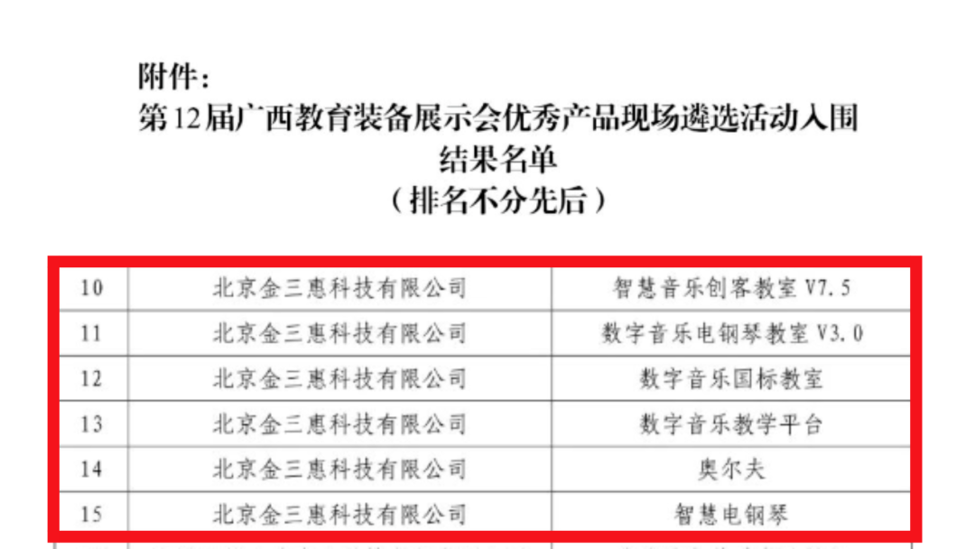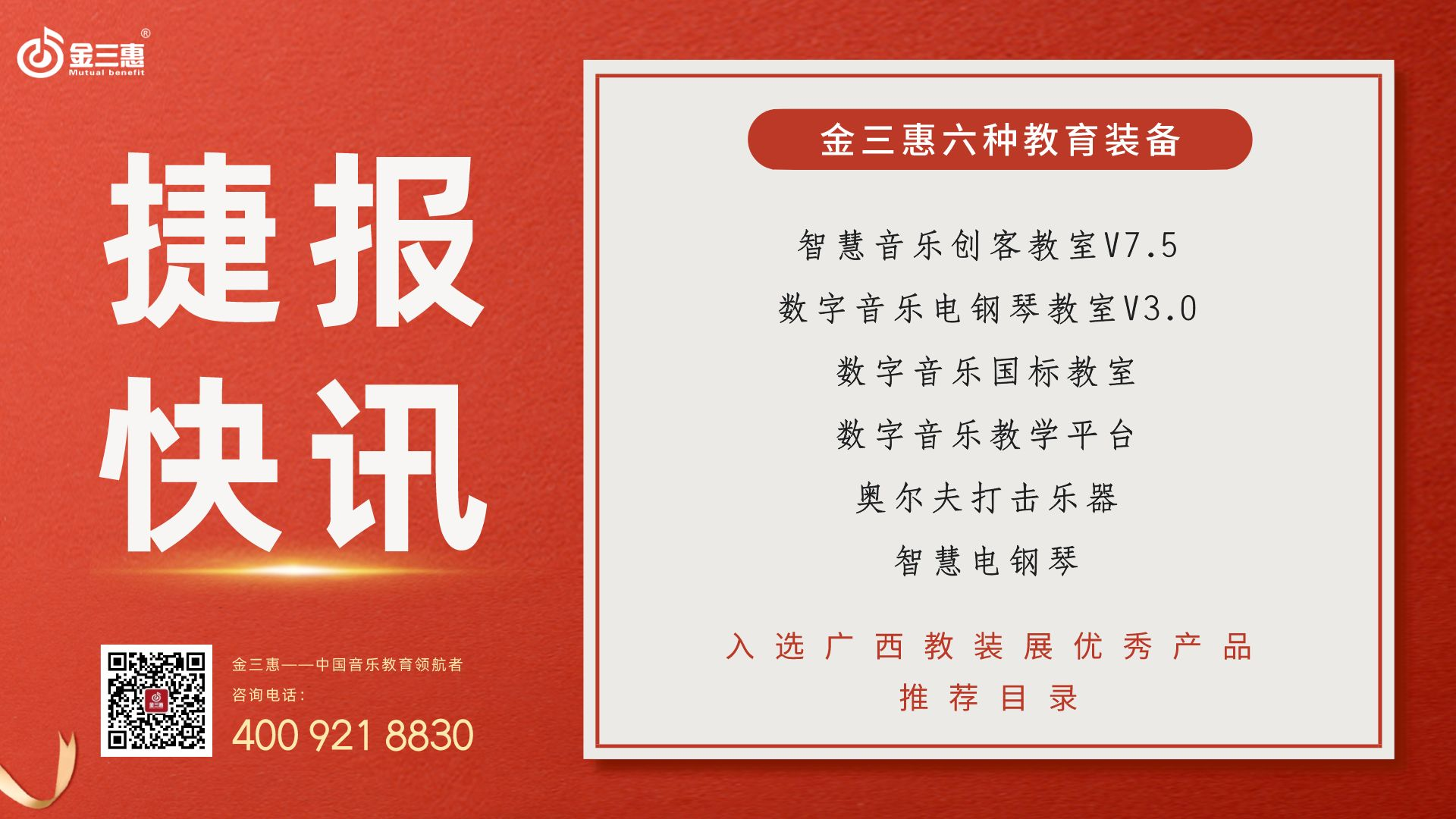 捷報快訊 2023年8月10日,廣西教育裝備行業協會發布《關于公布第12屆廣西教育裝備展示會優秀產品現場遴選活動入圍結果的通知》,金三惠自主研發的六種教育裝備——智慧音樂創客教室V7.5、數字音樂電鋼琴教室V3.0、數字音樂國標教室、數字音樂教學平臺、奧爾夫、智慧電鋼琴從眾多參評產品中脫穎而出,榮譽登榜!