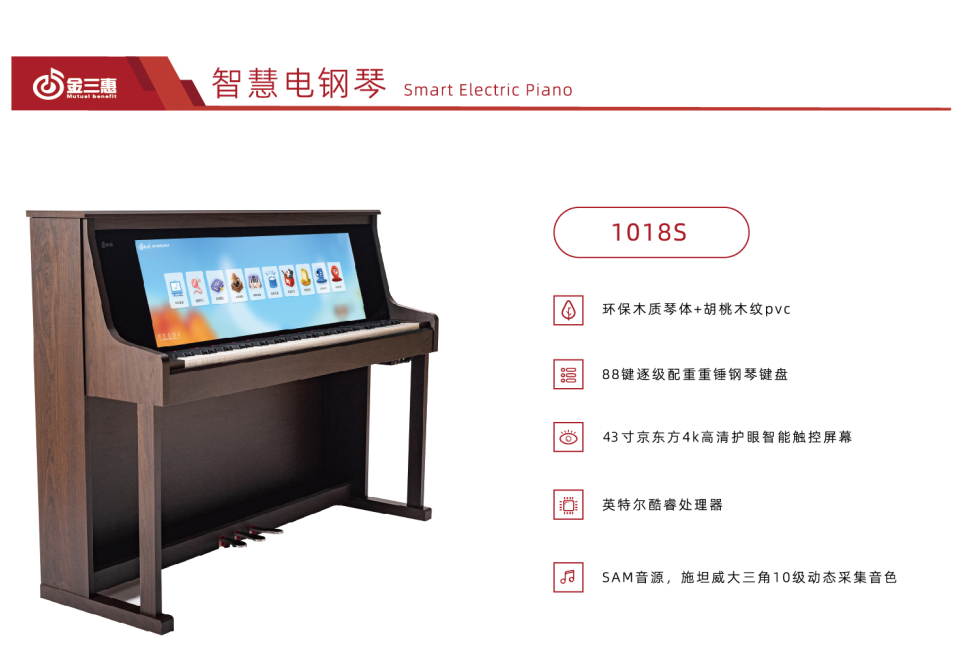 金三惠智慧電鋼琴(1018S) 推薦指數:⭐⭐⭐⭐⭐ 推薦理由: √采用定制43寸超寬京東方4k高清護眼智能屏,酷睿高性能CPU,施坦威鋼琴原聲采樣音源、AI智能音頻處理器、琴體采用國家一級環保板材,產品質量達到國內先進水平; √內置金三惠研發中心傾力打造的數字音樂教學系統,助力教師多元化教學,讓學生上課更輕松。