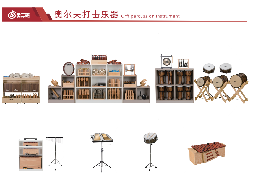 奧爾夫打擊樂器 推薦指數:⭐⭐⭐⭐⭐ 推薦理由: √每一件樂器均是金三惠匠心打造,采用櫸木材質,硬度、質感具佳; √發聲準確、清脆、均勻,結合綠色環保噴涂工藝做到無污染、無異味、很安全; √設計初衷充分考量教學應用場景,具有易用、易存、易保養的特點,體現了金三惠樂器工廠對于品質化、綠色化、智能化的不斷追求。