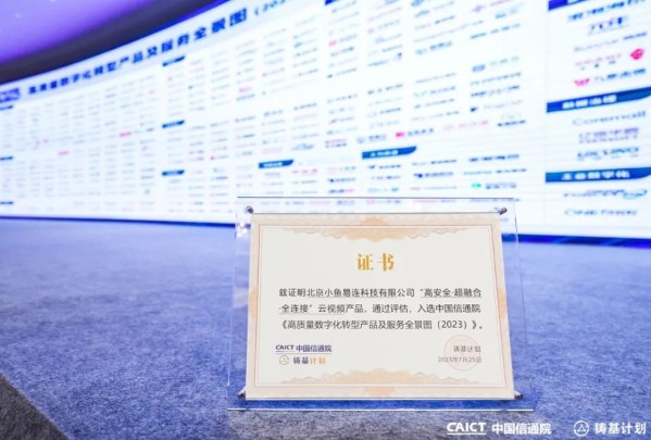 近期,由中國信息通信研究院主辦的“2023數字生態發展大會”暨中國信通院“鑄基計劃”年中會議順利召開,會上重磅發布了《高質量數字化轉型產品及服務全景圖(2023)》,小魚易連憑借“高安全·超融合·全連接”云視頻整體解決方案的領先技術和應用能力成功入選。這也是小魚易連繼2022年后再度獲此殊榮,云視頻以創新實力持續贏得權威機構的認可。
