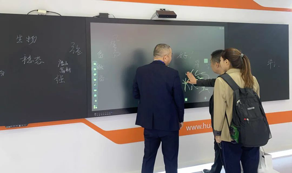 本次參展,華發教育帶來的是全新升級的納米銀智慧黑板。相對于其它電容智慧黑板,納米銀智慧黑板擁有透光度更高、電阻更小、反應速度更快的優勢。
