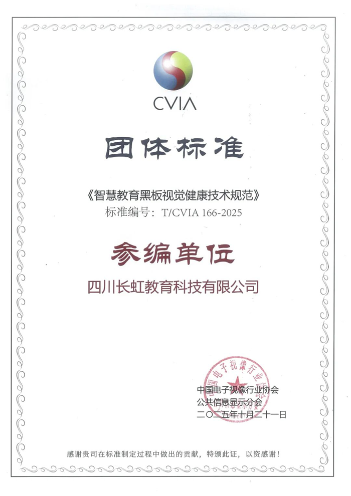 10月29日,2025深圳商用顯示技術(shù)展暨國(guó)際全觸與顯示展上,由四川長(zhǎng)虹教育科技有限公司聯(lián)合中國(guó)質(zhì)量認(rèn)證中心、中國(guó)科學(xué)技術(shù)大學(xué)等機(jī)構(gòu)共同起草的《智慧教育黑板視覺(jué)健康技術(shù)規(guī)范》正式發(fā)布。該標(biāo)準(zhǔn)由中國(guó)電子視像行業(yè)協(xié)會(huì)推出,是國(guó)內(nèi)首個(gè)系統(tǒng)性聚焦智慧教育黑板視覺(jué)健康的行業(yè)團(tuán)體標(biāo)準(zhǔn),為教室場(chǎng)景師生用眼安全筑起專(zhuān)業(yè)防線。