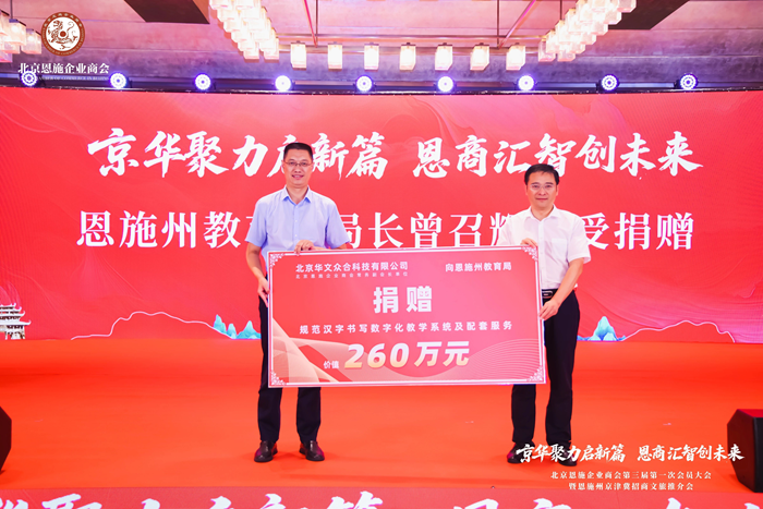 會(huì)上,大家共同見證了一場(chǎng)跨越山水的愛心傳遞——華文眾合董事長向大鳳代表公司向恩施州六縣二市100所中小學(xué)捐贈(zèng)價(jià)值260萬元的“規(guī)范漢字書寫數(shù)字化教學(xué)系統(tǒng)”及配套服務(wù),恩施州教育局黨組書記、局長曾召輝上臺(tái)接受捐贈(zèng)。這份厚重的“教育禮包”,旨在運(yùn)用科技力量,助力家鄉(xiāng)學(xué)子寫好中國字,傳承中華優(yōu)秀傳統(tǒng)文化,推動(dòng)教育均衡發(fā)展。