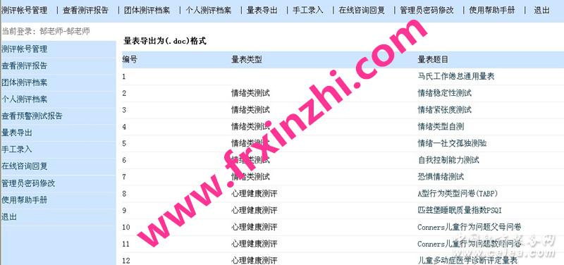 產品詳細介紹輔仁心智心理測評系統(綜合版),心理測試軟件,心理測評軟件 個性測試1.卡特爾十六種人格測驗(16PF) 適用于15歲以上青少年及成年人測查的全面的人格分析,可用于就業咨詢或人才選拔。 2.艾森克人格測驗(EPQ) 艾森克人格測驗適用于測試時間要求較短條件下人格分析。 3. 愛德華個人偏好測驗 愛德華個人偏好測驗適用于個人需求方面的人格分析,225題。 4. 明尼蘇達多相人格測驗(MMPI) 明尼蘇達多相人格測驗適用于進行較全面的人格分析。 5. 超常行為檢查測驗 超常行為檢查測驗適用于檢查是否具有超常行為特征,共97題。 6. 中國青年人格測驗(CPI) 中國青年人格測驗適用于人才選拔方面的人格分析。 7. 兒童自我意識測驗 本量表可適用于8-16歲兒童。 8. 十四種人格測驗(14PF) 適用于8-14歲的中小學生的人格分析。 9. 氣質測驗 氣質測驗,60題。目前國內應用較廣的一種氣質測驗工具。 10.人生觀測驗 適用于已形成了對人性相對固定看法的18歲以上的成年人。 11.自信心測驗 自信心測驗共13道題,適用于18歲以上成年人。 12.自卑感測驗 適用于中學生、大學生及成年人使用。 13.樂觀性測驗 這個測驗還將告訴你如何看待生活,如何做一個積極樂觀的人! 14.固執性測驗 通過固執性測驗來看看你屬于哪一種人。 15.個性成熟度測驗 個性成熟度測驗來測試一個人生經驗豐富的程度。 心理健康測試16.心理健康臨床癥狀自評(SCL-90) 心理健康臨床癥狀自評適用于測查被試的心理健康狀況。 17.抑郁自評量表 適用于測查被試最近一段時間的的抑郁程度. 18.焦慮自評量表 適用于測查被試最近一段時間的焦慮程度. 19.中小學生心理健康測驗(MHT) 綜合檢測中小學生的心理健康狀況。 20.大學生人格健康調查測驗(UPI) 適用于篩查大學生的心理健康狀況的篩查 21.Beck抑郁測驗 適用于分析成年人各年齡段的抑郁感強度。 22.生活事件測驗 包括家庭生活、工作學習方面、社交及其他,三方面的問題。 23.青少年生活事件測驗 適用于小學高年級、初中和高中學生面臨挫折事件的承受程度。 24.大學生行為問題測驗 能夠較為準確而迅速的反映出該學生目前是否存在嚴重的行為問題。 25.Achenbach兒童行為測驗 適用于測查4-16歲兒童的不同行為問題。 26.中小學生適應能力測驗 學生的學習、生活環境的協調程度。 27.壓力應對方式測驗 用于初中以上形成相對穩定應對方式的被試使用。 28.兒童多動癥核查測驗 兒童多動癥核查適合診斷年齡低于17歲的兒童是否具有多動行為傾向。 29.網絡成癮測驗 中學生網絡成癮量表可用于測查中學生使用網絡的情況。 30.兒童孤獨測驗 用于評定挑選出不合群的兒童,并了解最不被同學接受的兒童是不是最孤獨。 31.自殺態度測驗 適用于分析16歲以上的人群對自殺的態度。 32.社會適應性自評測驗 本問卷將幫助被測試者了解自己的心理成熟程度。