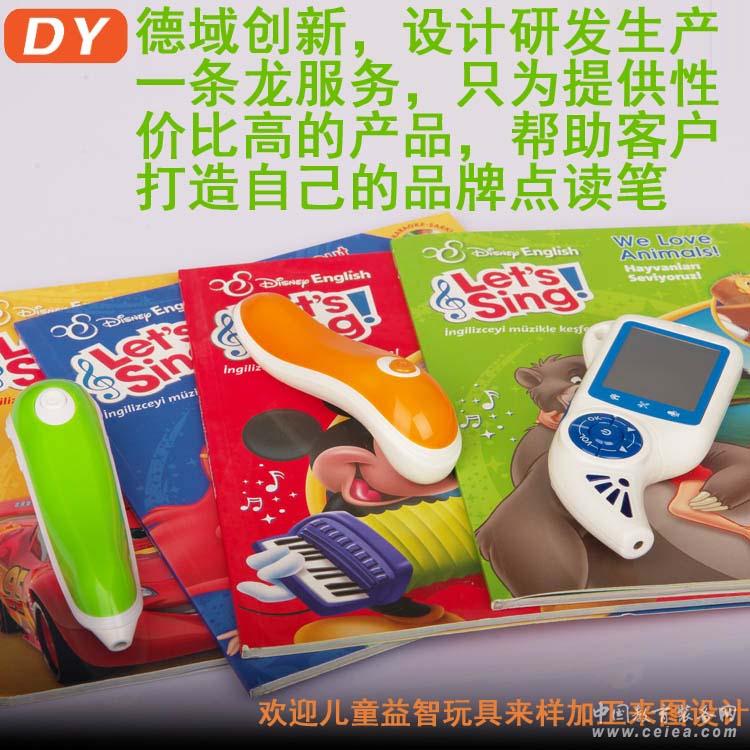 產(chǎn)品詳細介紹點讀筆定制方案,專業(yè)點讀筆廠家提供 德域公司于2011年成功推出了點讀筆系列方案,屬于國內(nèi)最早一批專注投入研發(fā)點讀筆方案的公司,為客戶提供點讀筆專業(yè)研發(fā)、有聲圖書編錄、外殼開模注塑、OEM\ODM、方案選擇。 目前市面上有用到松翰、凌陽、KB、格萊、美哲、安凱、瑞芯微等方案,松翰方案是應(yīng)用最多最穩(wěn)定的方案之一。我們可以根據(jù)客戶具體需求訂制,有效控制成本提供好的價格與技術(shù)支持, 目前是行業(yè)公認最專業(yè)、最有竟?fàn)幜Φ膹S家之一。 2015年德域與臺灣點讀方案公司松翰達成戰(zhàn)略合作關(guān)系共同研發(fā)新一代點讀芯片組,開放研究實驗室與點讀方案共同協(xié)作研發(fā),同時擴大生產(chǎn)規(guī)模,創(chuàng)建目前國內(nèi)最大的點讀筆OEM生產(chǎn)基地(7000平方米)。 首先看看點讀筆能用在哪些地方。 點讀筆常見應(yīng)用如下: 1)幼兒早教類:幼兒圖書、幼兒地墊、幼兒掛圖、故事機、有聲成長日記、有聲相冊、DIY錄音 2)學(xué)生學(xué)習(xí)類:教材、有聲詞典、有聲詞典卡、單詞卡片、有聲課堂記錄本 3)成人類:多國學(xué)習(xí)教材、旅游手冊、有聲記錄本,語音點讀地球儀,古蘭經(jīng),佛學(xué)點讀,中醫(yī)穴位點讀等 4)特殊應(yīng)用:身份識別系統(tǒng)、防偽、有聲地圖、盲人學(xué)習(xí)、視頻教學(xué)、人機互動學(xué)習(xí)、聲控儀