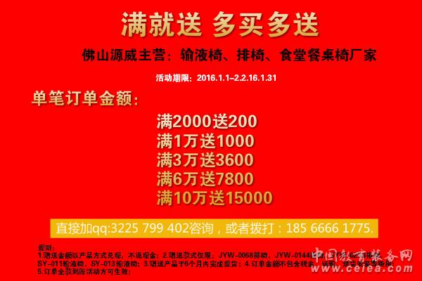 看到這條貼的時候,請您不要驚訝!此信息是真的!是佛山源威從2003年至今為止第一次讓利活動促銷.最高讓利點達15%,心動不如行動。具體活動規則如下: 一、單筆訂單金額: 滿2000送200; 滿1萬送1000; 滿3萬送3600; 滿6萬送7800; 滿10萬送15000; 多買多送; 溫馨提示:如果您的單筆訂單金額不滿足贈送條件時,可補差額預留作下筆訂單費用。 二、規則: 1.贈送金額以產品方式兌現,不返現金; 2.贈送款式僅限:JYW-0068排椅,JYW-0144排椅,JYW-0266排椅,SY-011輸液椅,SY-013輸液椅; 3.贈送產品于6個月內完成提貨; 4.訂單金額不包含稅金,運輸,送貨安裝等費用; 5.訂單全款到賬活動方可生效; 6.活動期限:2016年1月1日至2016年1月31日;顒佑衅谙,且行且珍惜!