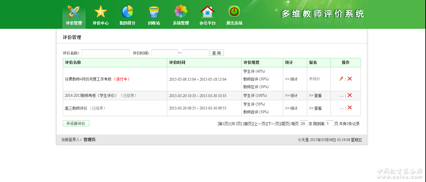 產(chǎn)品詳細(xì)介紹教師專業(yè)發(fā)展性評價(jià)系統(tǒng)是一套為提高教師的教學(xué)質(zhì)量,反饋學(xué)生的心聲,提高學(xué)校教務(wù)管理能力的系統(tǒng)。針對各專業(yè)所授課程及教師的評價(jià)結(jié)果,直觀的統(tǒng)計(jì)出每位教師的綜合能力。其中包含領(lǐng)導(dǎo)評、專家評、教師互評、學(xué)生評、家長評五維一體的評價(jià)系統(tǒng),并支持去掉最高比例與最低比例值后的最終數(shù)據(jù),真正做到公平、公正、公開。 |