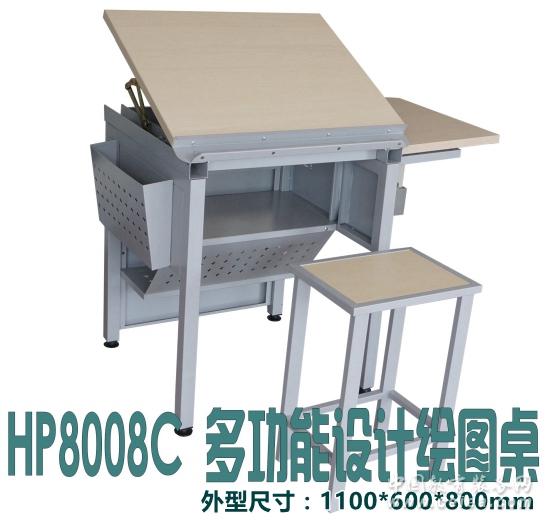 技術結構參數: 1)整體鋼架結構: 采用全鋼支架雙支撐結構,采用國標800mm高度;標配主、副桌面,均采用厚度2.5cm E1環保三聚氰胺板桌面基板;配置有多個儲物空間; 2)繪圖桌面板(可傾角調節0-80°)和副桌面 配置繪圖主桌面板(700×550mm),主桌面板左、右雙側背部采用“惠普”繪圖專用傾角調節鉸鏈,同步控制調節傾斜度調節0-80°;桌右側為副桌面板(400×550mm),采用“惠普”專利折疊結構,滿足教學和繪圖作業配套放置電腦、文具、書籍等需求;不使用時可以下掛節省空間,便于教室行走; 3)五處儲物空間 主桌面板下端配置有筆槽,槽二端采用圓弧安全角處理,筆槽高出桌面可擋住繪畫繪圖板或者丁字尺等物品;桌面板背后部配置有鋼制儲物廂,桌架左側配置有書籍儲物簍,中層儲物擱板和隔板下部的圖紙廂等五個儲物空間。 4)穩定性調節腳墊 底部采用塑膠木水平調整螺絲腳墊,可防滑、防噪音,具有調節功能,保證桌面穩定和結構的堅固。