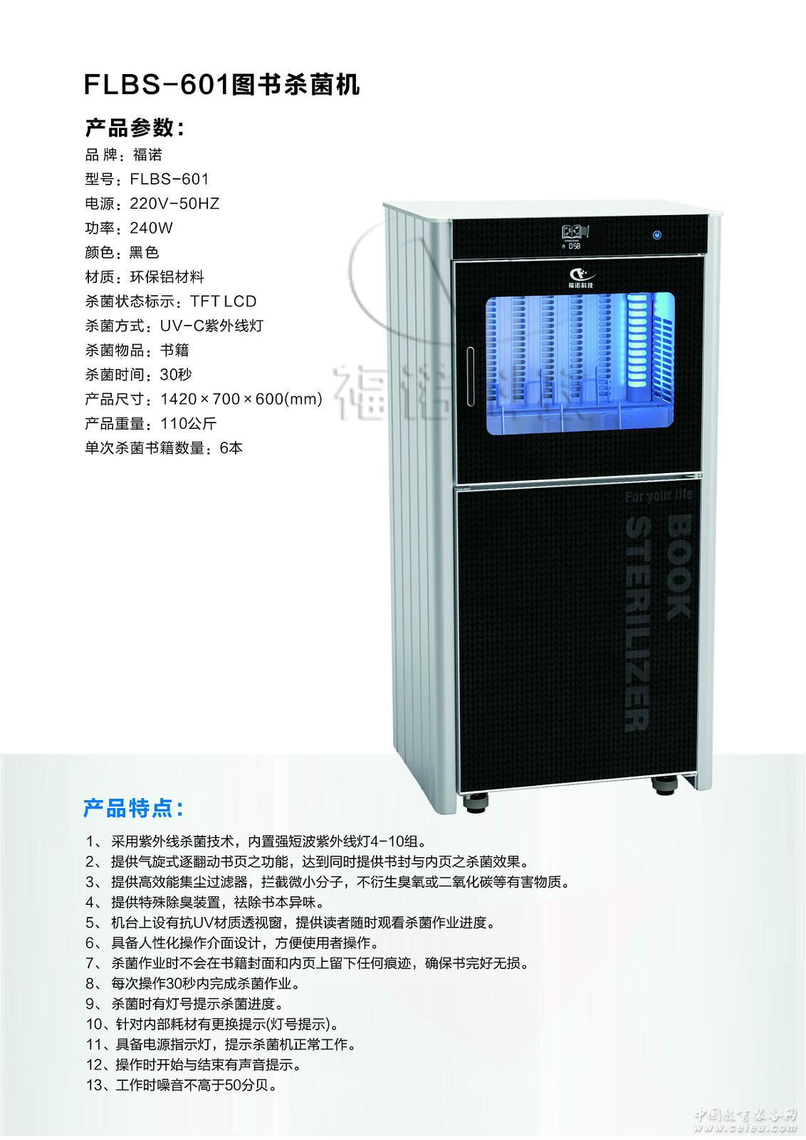 產品詳細介紹FLBS-601自助圖書殺菌機 你正在閱讀的圖書衛生嗎? 很多書蟲,細菌,例如新型的甲型流感(H1N1)病毒,大腸桿菌,灰塵,霉菌和傳染性病毒的細菌駐留在圖書館的書籍里。還有些化學物質,如氨,二甲苯和甲醛是在產生于制造書籍的過程中,這些化學物質是誘導癌癥的致命原因。那些常年被保存在在圖書館的圖書,是這些書蟲和細菌滋長的溫床,如果不能夠及時清理,會一定程度的損壞寶貴的藏書,也會導致人體的皮膚疾病。各種感染病毒,如新型的的甲型流感病毒(H1N1),大腸桿菌,霉菌和書蟲聚集的書籍里面誘發細菌感染,可以誘發過敏性疾病和威脅到人體的其他疾病.FLBS系列自助圖書殺菌機專門為讀書人的健康考慮,能夠完美去除各種細菌,病毒。 產品參數: 型號 FLBS-601 電源 220V/50HZ 輸入功率 250W 殺菌方式 UV-C紫外線 殺菌物品 書籍 單次殺菌書籍數量 6本 殺菌時間 30秒 控制方式 一鍵式啟動 殺菌狀態標示 TFT LCD 產品顏色 黑色 外型尺寸(高*寬*深) 1420×700×600mm 柜體材質說明 雙層環保鋁型材 產品重量 110公斤 產品特點: 1、機器滿足使用者自行操作圖書殺菌作業的功能要求; 2、機器使用工作溫度:攝氏 -10~50度。環境濕度:10%~90%; 3、采用環保鋁材料制造,更美觀。同時能達到光的二次反射,增強殺菌效果; 4、采用紫外線殺菌技術,內置強短波紫外線燈8組(含)以上。 5、提供氣旋式逐翻動書頁之功能,達到同時提供書封與內頁之殺菌效果。 6、提供2組或以上高效能集塵過濾器,攔截微小分子,不衍生臭氧或二氧化碳等有害物質。 7、特殊去異味過濾裝置,能收集微小分子,不衍生臭氧或二氧化碳等有害物質。 8、采用在森林中對人體起到緩解壓力作用的100%天然植物殺菌素,增強殺菌效果,同時可去除圖書中的致癌物質二甲苯,氨等異味 9、機臺上設有抗UV材質透視窗,提供讀者隨時觀看殺菌作業進度。 10、具備人性化操作介面設計,方便使用者操作。 11、殺菌作業不得于書籍封面或內頁留下刮痕或任何損害痕跡。 12、每次操作于30秒內完成殺菌作業。 13、機器內部設有按鍵,可以看到本機器使用累計的時間與次數,同時,工作人員對消毒時間可以自行調節設置。 14、殺菌時有燈號提示殺菌進度。 15、針對內部耗材有更換提示。 16、具備電源指示燈,提示殺菌機正常工作。 17、操作時開始與結束有聲音提示。 18、噪音小,開關噪音不高于50分貝。 19、為防止在殺菌過程中使用者打開殺菌室門,必須設有安全裝置立即暫停運轉。 20、操作界面具備警示器設計,操作完成或發生錯誤時可自動發出聲響提醒使用者。 21、產品外觀可根據用戶要求定制LOGO。 30秒殺菌,讓您能夠快速閱讀到干凈的圖書! (內部圖) 電話15397165767 |