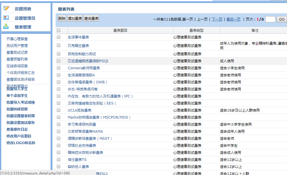 產品詳細介紹擁有110個最新修訂量表量表,包含最權威的scl90等 軟件完全按照學校日常的分級管理而設計,主要分為校級管理員(分管心理健康教育的校長、心理輔導老師等)、班級管理員(班主任、輔導老師、學科老師等)和測評人員(學生或老師或家長)三個登陸端口。 校級管理員可以直接管理全校學生,班級管理員只能看到本班學生情況。(教育部明確指出心理健康教育的主力軍是班主任,所以班主任通過該系統了解每個學生的情況是非常有必要的。) 軟件還擁有:心理普查、測試用戶管理、查看測試記錄、查看預警列表、在線咨詢、個體測評報告匯總、查看團體測評報告、測試數據導出、批量導入學生、單個添加學生、批量導入考試成績、批量轉移班級、批量設置量表權限、批量設置測試報告、修改LOGO和名稱等功能,大大降低了心理老師的工作時間,提高了工作效率與管理質量。 |
