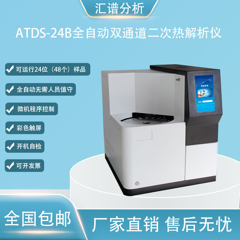 產品詳細介紹ATDS-24B全自動雙通道二次熱解析儀 一、儀器簡介 ATDS-24B全自動雙通道二次熱解吸儀是匯譜分析儀器制造河北有限公司自主研制推出直接面向國內外廣大用戶的換代產品。該儀器適用于對化工建筑材料、食品、大氣及室內環境中沸點在350℃以下各種氣體的定性、定量檢測,可與國內、國外氣相色譜儀、氣質聯用儀相連,其自動化程度、重復性和靈敏度等指標完全能夠滿足目前國家新頒布的有關環境檢測的標準,并且在結構上具有自身獨特的功能優勢及令人滿意的性能與價格比。全自動化設計、觸摸大屏顯示、操作更為方便,可連續運行24個樣品的新一代全自動熱解吸。 二、儀器特點和主要功能 1、 可以自動運行雙24位(48個)樣品,無需人員值守; 2、開機自檢,故障報警和提示,自動定位、校準樣品盤; 3、計算機USB通訊接口,所有參數、方法均在PC端設置完成,7寸大屏幕液晶觸摸屏,微機程序控制; 3、 微機程序控制,主要功能有: ⑴ 方法參數設置、實時動畫顯示工作狀態、運行時間;  ⑵ 解吸區、進樣閥、樣品傳輸管和二次解吸區,四路均單獨加熱控溫; ⑶ 設定好分析程序,按下運行鍵自動完成全部樣品分析; ⑷ 可同步啟動GC、色譜數據處理工作站,也可用外來程序啟動本裝置; 4、本機自帶標樣模擬采樣的功能,可以更方便的通過熱解吸儀制作工作曲線; 5、通過時間編程,自動實現干吹、吹掃吸附、解吸、進樣、反吹清洗等功能; 6、氣路采用鈍化管路, 樣品傳輸管和進樣閥有自動反吹功能,避免了不同樣品的交叉污染; 7、采用電子制冷和二階熱脫附流程以保證得到窄的色譜峰形; 8、本機自帶標樣模擬采樣的功能,方便獲取工作曲線; 9、為了配套進口氣相色譜儀使用起來更方便,本儀器還配有針對各種進口儀器的專用接口,連接方便; 10、20種以上編輯方法,方便編輯保存、調用; 11、新增中英文切換、用戶管理、日志等功能; 12、進樣側孔針頭更換方便,可連接國內外所有型號的GC進樣口。