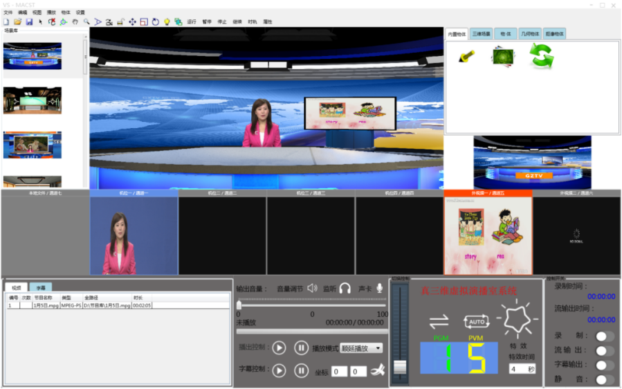 5)導播 導播模式:手動/半自動/自動模式。 支持多種自定義特效。 支持任意虛擬機位之間的特效切換功能。 支持虛擬機位和外視頻、本地媒體播放之間的特效切換功能; 外視頻及本地媒體播放,即支持任意多路虛擬大屏幕,同時也支持通道之間特效切換。 支持JPG、PNG格式臺標。 支持圖片字幕和文本字幕疊加。 支持外接專用虛擬搖臂導播鍵盤。
