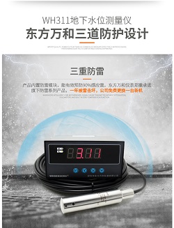 防雷專用水庫水位液位控制器,水位顯示器WH311專為 多雷雨季節地區持續液位測量而設計,其核心部 件采用國際知名品牌液位傳感器經合理精密的結 構設計及厚膜技術溫度補償、獨有設計三重防雷 模塊裝置,三道防雷工序能有效預防95%的感應雷 擊損壞,有效保證了WH311防雷液位變送器在多雷 雨季節液位測量使用的安全性, 有效解決了多雷 雨地區液體液位測量困難的問題。 萬和儀表鄭重承諾,凡是萬和儀表防雷系列產 品,一年內被雷擊損壞,免費更換新機。