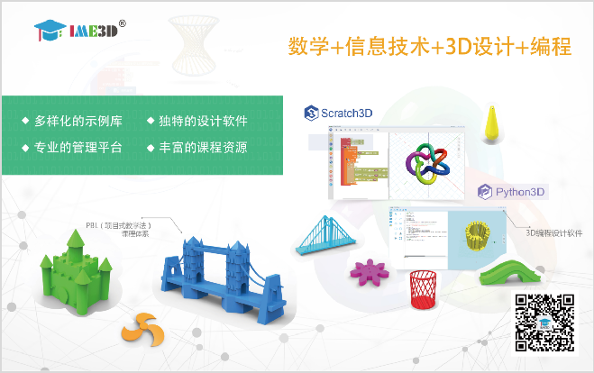 產品詳細介紹 該實驗室結合圖形化編程(Scratch)和代碼編程(Python)方式,以【數學知識+信息技術+3D設計+編程】為主要切入點,選用IME3D系列化軟件中的3D編程設計軟件Scrath3D和Python3D,及其配套的項目制(PBL)基礎和主題課程體系,將編程邏輯、3D設計和開源硬件相結合,開展編程式3D設計教育課程和各項活動。