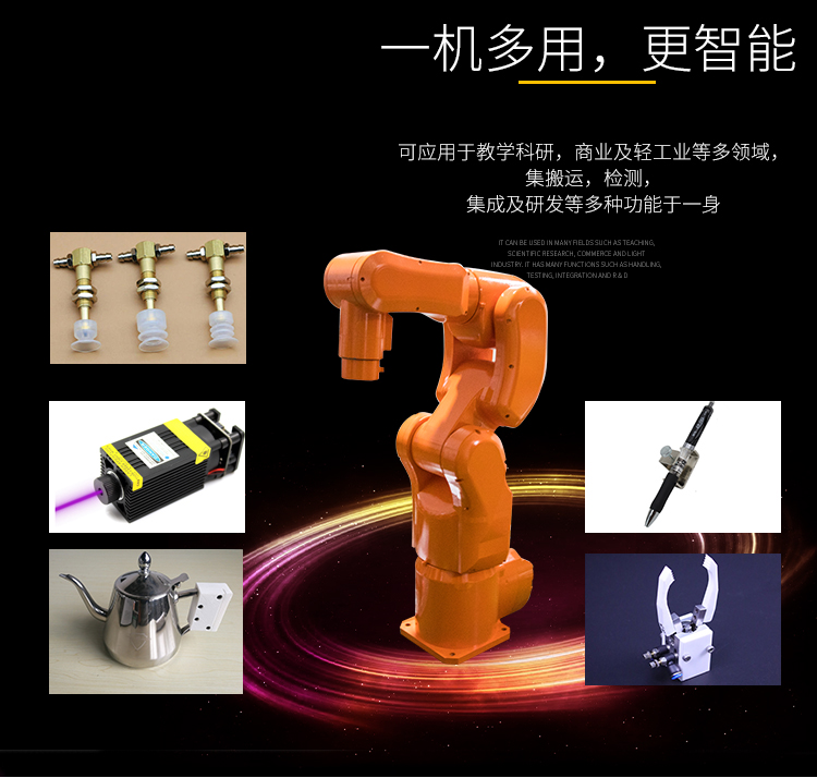 產(chǎn)品詳細介紹輕量化、微型化、功能全;是濃縮了企業(yè)一線制造車間用的工業(yè)機 器人所有的基本功能,真實的機器人控制系統(tǒng),與 ABB/安川等品牌機器人編程語言規(guī) 則相似,提高學生編程能力。可搭配舞獅服飾或寫字夾具、吸盤,用于娛樂或觀賞應用 編程學習和機器人寫字或搬運碼垛編程應用。六自由度機器人是一款針對高校教學應 用開發(fā)的六軸機器人。機器人結構緊湊、體積小、重量輕、其最大負載 5KG,臂展活動 范圍540mm。腕部采用中空結構,走線更方便、動作更靈活 |