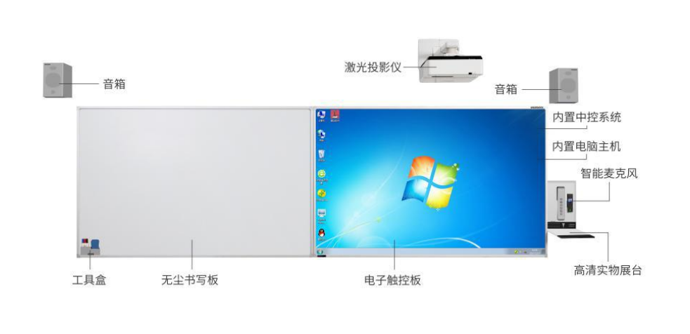 產(chǎn)品詳細(xì)介紹宏大智慧白板(交互式電子白板一體機(jī)雙拼組合):高度集成無塵書寫板、電子觸控板、音箱、多媒體設(shè)備(控制終端、中控系統(tǒng)、功放、高清實(shí)物展臺),整體厚度不大于110mm,無塵書寫板外觀尺寸90-150寸;