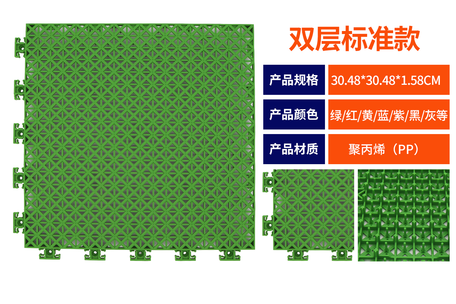 34 (長) ×34 (寬) ×1.58cm (高) 雙層軟連接 單片重量 340g±5 克 2 、材料: 采用食品級全新聚丙烯(PP)高強度改性材料和進口助劑生產,保證產品環保性和耐侯性 3 、連接方式: 新型方形彈簧式伸縮扣,有效緩解熱脹冷縮(專利設計) 4 、自帶隱藏式連接地面螺絲孔: 防止場地地板走位移動及地板受氣溫影響引起的拉伸和收縮,能使產品定位 于地面,并不影響美觀及無任何安全隱患 5 、面層結構: 啞光防眩光表面,強光下不刺眼、不反光,防止地板在日照情況下出現眩光情況; 磨砂曬紋表面,增強地板表層耐磨與防滑度,保證雙重緩沖作用,提升運動安全舒適性, 雙層米字棱形鏤空面層,雙層結構使產品的物理性能加強,在長時間的戶外鋪裝中,雙層地板的 場地變形基數遠低于單面層地板。 6 、底部結構: 底部多個加粗加密式十字形懸浮支撐柱,提供垂直緩沖效果, 導水槽結構,實現快速排水,防止場地大面積積水。