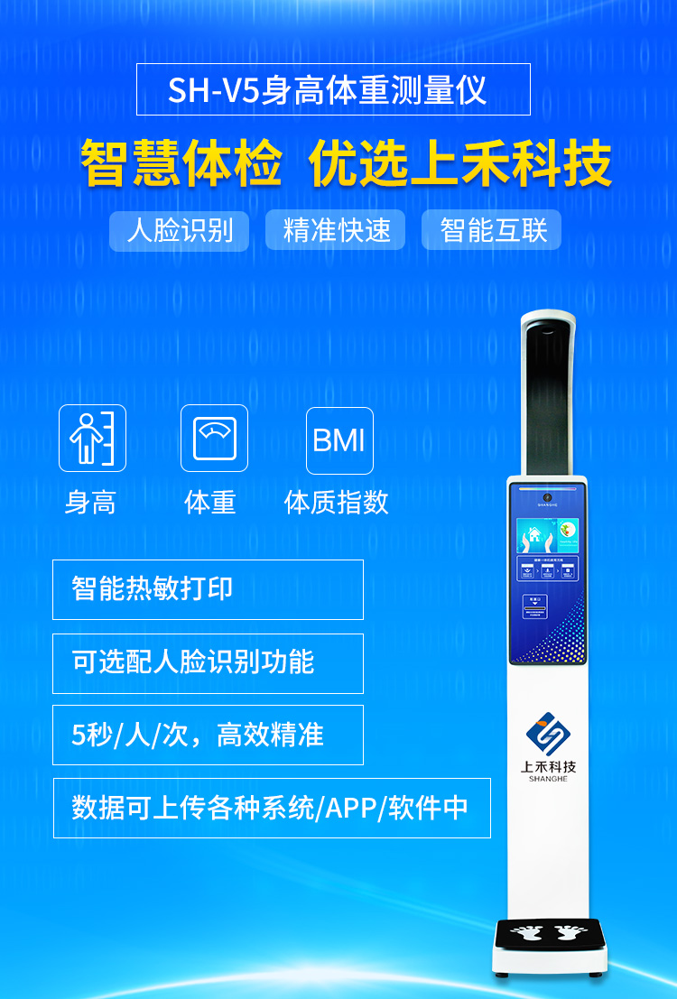 產品詳細介紹超聲波無接觸測量身高、潔凈、衛生,測量速度快,測量精度高 操作系統:采用專業為健康體檢深度定制安卓4.4智能最新OS操作系統,可選擇單項測量,全部順序測量等模式,全程智能語音和動畫提示操作簡單, 通訊方式:提供RS232接口和WiFi接口,藍牙(選配),3G/4G(選配)RJ45網口(選配)。 可與第三方系統數據通信;兼容與醫院、電子病例(EMR)、HIS健康體檢系統數據共享通信; 體重測量方式:高精度、高靈敏、高性能精密平衡梁電阻應變式壓力傳感器稱重身高測量方式:采用美國進口SensComp超聲波傳感器并實現溫度補償功能, 身高測量:20-210cm, 鑒定精度:±0.5cm 分度值:0.5cm或0.1cm可調 體重測量:2.0-500KG,鑒定精度:±0.1kg 分度值:0.1kg或0.01kg可調 BMI體型:采用最新WHO標準或者中國九城市標準(客戶可根據自己需求進行調成)自動計算 *LCD顯示:采用10.2寸高清彩色液晶屏,超大字體,醒目清晰顯示,日期時間溫度,與網絡同步,時間準確,顯示體型體型偏胖、正常、偏瘦。 打印功能:采用高速熱敏易裝打印機實現自動打印自動切紙,換紙方便,打印身高體重BMI,理想體重和體重正常范圍等多種信息,還可設置打印醫療衛生單位名稱, 例如:某某疾病預防控制中心某某社區。 自動語音播報:清晰語音報出測量數值并且客戶可以根據使用情況設置提示語音 微信推廣:設備并提供測量數據和微信公眾號的綁定,居民在通過微信掃一掃手機獲取測量數據的同時關注醫療單位公眾號,并提供健康建議,生成健康曲線方便用戶關注體重對健康的影響,方便醫療單位健康知識的宣傳和衛生政策的傳達。 數據存儲:可存儲100萬條以上測量數據,并支持U盤導出, 多媒體廣告屏:采用10.2寸彩色高清液晶屏觸摸大屏,液晶屏上可以設置顯示使用單位名稱, 例如:某某疾病預防控制中心某某社區。自動循環播放視頻音頻及圖片宣傳健康知識或衛生醫療政策,使用單位可以自己更換宣傳片,非常方便。 電源電壓:采用AC100V-240V/12V直流電源,輸入寬電壓適合電壓不穩定地區 消耗功率:待機15W,工作時平均25W 工作環境:溫度-10℃至+40℃ 濕度:20%-85%PH; 推薦使用:醫院、社區服務站、疾控中心、體檢中心、養老中心,企事業單位等部門和單位;