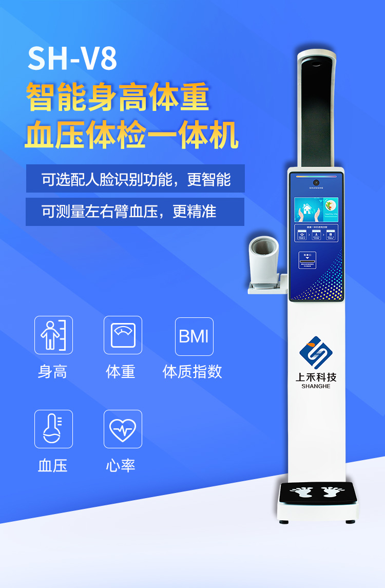 產(chǎn)品詳細(xì)介紹超聲波無(wú)接觸測(cè)量身高、潔凈、衛(wèi)生,測(cè)量速度快,測(cè)量精度高 操作系統(tǒng):采用專業(yè)為健康體檢深度定制安卓智4.4能最新OS操作系統(tǒng),可選擇單項(xiàng)測(cè)量,全部順序測(cè)量等模式,全程智能語(yǔ)音和動(dòng)畫提示操作簡(jiǎn)單, 通訊方式:提供RS232接口和WiFi接口,藍(lán)牙(選配),3G/4G(選配)RJ45網(wǎng)口(選配)。 可與第三方系統(tǒng)數(shù)據(jù)通信;兼容與醫(yī)院、電子病例(EMR)、HIS健康體檢系統(tǒng)數(shù)據(jù)共享通信; 體重測(cè)量方式:精度、高靈敏、高性能精密平衡梁電阻應(yīng)變式壓力傳感器稱重 身高測(cè)量方式:采用美國(guó)進(jìn)口SensComp超聲波傳感器并實(shí)現(xiàn)溫度補(bǔ)償功能, 身高測(cè)量:20-210cm, 鑒定精度:±0.5cm 分度值:0.5cm或0.1cm可調(diào) 體重測(cè)量:2.0-500KG,鑒定精度:±0.1kg 分度值:0.1kg或0.01kg可調(diào) BMI體型:采用最新WHO標(biāo)準(zhǔn)或者中國(guó)九城市標(biāo)準(zhǔn)(客戶可根據(jù)自己需求進(jìn)行調(diào)成)自動(dòng)計(jì)算 血壓測(cè)量:1、方式:采用上臂式血壓計(jì)測(cè)量(支持左右血壓測(cè)量) 2、性能:智能加壓技術(shù)、示波測(cè)定法測(cè)量高壓、低壓、心率 3、范圍:血壓:0-299mmHg(0-39.9kpa) 脈搏:40-180times/min 4、精度:壓力:±3MmHg(±0.4kpa)內(nèi) 脈搏數(shù):±5% LCD顯示:采用10.2寸高清彩色液晶屏,超大字體,醒目清晰顯示,日期時(shí)間溫度,與網(wǎng)絡(luò)同步,時(shí)間準(zhǔn)確,顯示體型體型偏胖、正常、偏瘦。 打印功能:采用高速熱敏易裝打印機(jī)實(shí)現(xiàn)自動(dòng)打印自動(dòng)切紙,換紙方便,打印身高體重BMI,理想體重和體重正常范圍等多種信息,還可設(shè)置打印醫(yī)療衛(wèi)生單位名稱, 例如:某某疾病預(yù)防控制中心某某社區(qū)。 自動(dòng)語(yǔ)音播報(bào):清晰語(yǔ)音報(bào)出測(cè)量數(shù)值并且客戶可以根據(jù)使用情況設(shè)置提示語(yǔ)音 微信推廣:設(shè)備并提供測(cè)量數(shù)據(jù)和微信公眾號(hào)的綁定,居民在通過(guò)微信掃一掃手機(jī)獲取測(cè)量數(shù)據(jù)的同時(shí)關(guān)注醫(yī)療單位公眾號(hào),并提供健康建議,生成健康曲線方便用戶關(guān)注體重對(duì)健康的影響,方便醫(yī)療單位健康知識(shí)的宣傳和衛(wèi)生政策的傳達(dá)。 數(shù)據(jù)存儲(chǔ):可存儲(chǔ)100萬(wàn)條以上測(cè)量數(shù)據(jù),并支持U盤導(dǎo)出, 多媒體廣告屏:采用10.2寸彩色高清液晶屏觸摸大屏,液晶屏上可以設(shè)置顯示使用單位名稱, 例如:某某疾病預(yù)防控制中心某某社區(qū)。自動(dòng)循環(huán)播放視頻音頻及圖片宣傳健康知識(shí)或衛(wèi)生醫(yī)療政策,使用單位可以自己更換宣傳片,非常方便。 電源電壓:采用AC100V-240V/12V直流電源,輸入寬電壓適合電壓不穩(wěn)定地區(qū) 消耗功率:待機(jī)15W,工作時(shí)平均25W 工作環(huán)境:溫度-10℃至+40℃ 濕度:20%-85%PH; 推薦使用:醫(yī)院、社區(qū)服務(wù)站、疾控中心、體檢中心、養(yǎng)老中心,企事業(yè)單位等部門和單位;