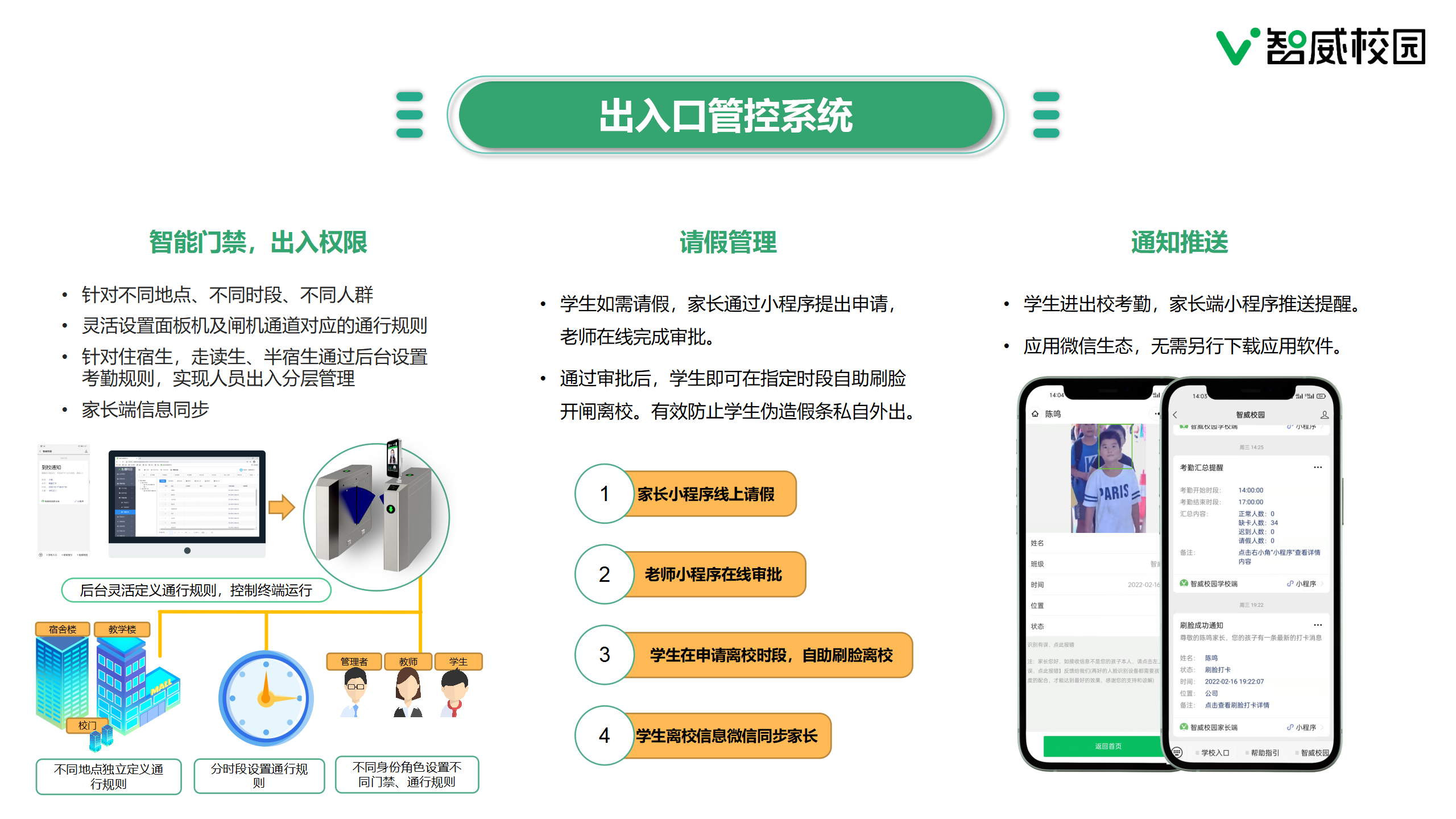 產(chǎn)品詳細(xì)介紹智能門禁,出入權(quán)限 針對不同地點(diǎn)、不同時段、不同人群 靈活設(shè)置面板機(jī)及閘機(jī)通道對應(yīng)的通行規(guī)則 針對住宿生,走讀生、半宿生通過后臺設(shè)置考勤規(guī)則,實(shí)現(xiàn)人員出入分層管理 家長端信息同步