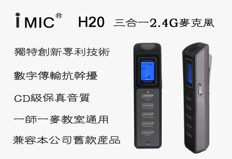 產品詳細介紹產品使用特點: 采用本司最新專利技術設計生產,有效的提高了同類產品的使用壽命。 44.1K音頻數據采樣,CD級的音質具有語音清晰飽滿、無噪音的優點。 開機自動尋找干凈的通信頻段,有效避開WIFI等設備的干擾。 音頻調制/解調過程全數字化,采用數字加密技術。具有抗干擾性強、通用性好、可以做到一咪通用所有教室的優點。 具有麥克風、激光指示、遙控電腦PPT等文檔翻頁功能,各項功能同時使用互不干擾。 具有體積小、便于攜帶,個人使用安全衛生。 使用方式可手持、可胸掛,可外接其他有線麥克風使用。 兼容本公司以往老產品,方便客戶更新換代。