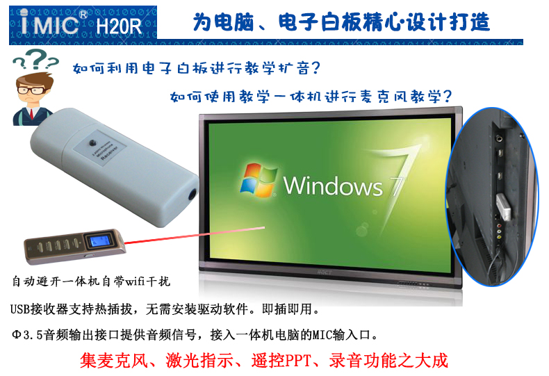 產品使用: 1. 將接收器USB連線插入電腦(一體機、電子白板)。 2. 將3.5音頻連接線插入電腦mic插孔(粉紅色)。 3. 將天線(鞭狀或貼片)連接在接收器的銅頭上,擰緊。并引至一體機上外沿。 4. 接通一體機電源進行測試,接收器指示燈發出一閃一閃亮光,表示處于等待對碼連接狀態。 5. 距接收器3米范圍內,打開麥克風側向的電源開關,聽到會聽到電腦揚聲器發出“嗶嗶”提示音,表示連接成功。接收器指示燈轉為常亮狀態,可使用麥克風進行教學擴音。 6. 測試完畢后,與一體機鑲嵌于墻體內。 注:若一體機本身內置揚聲器擴音音量不足時,可選擇配置本司出品的有源跟隨擴音音箱,將老師的聲音均勻的傳至教室的每個角落。數量根據教室大小選擇插電即用。 錄音功能是需要配合我們提供的錄音軟件使用,該軟件為綠色軟件,不會在電腦上生成根目錄。軟件免費提供,客戶可自主決定是否使用。 |