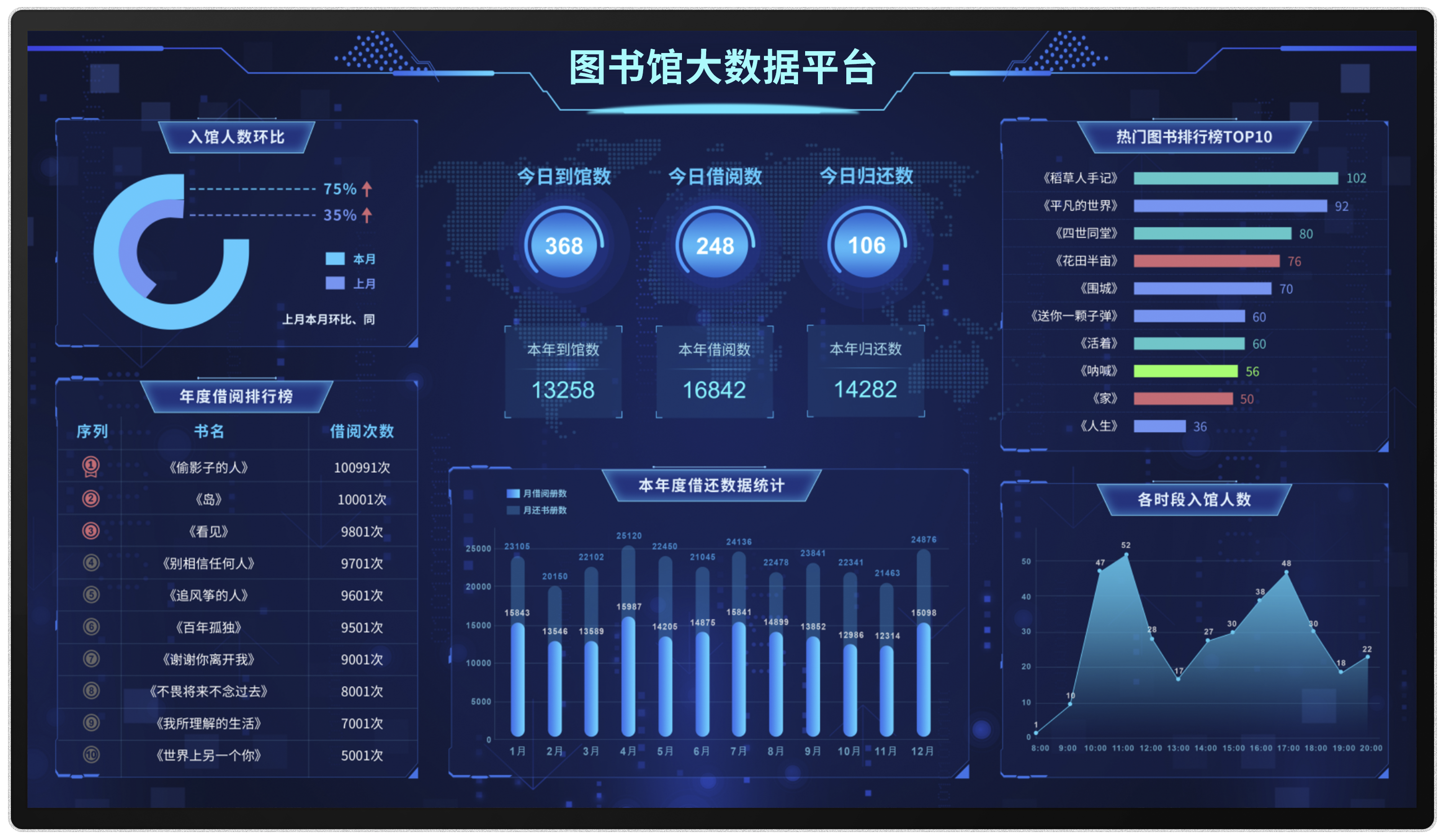 產品詳細介紹1、可展示圖書館的預設圖片 2、實時展示圖書館的業務數據,包括日借閱人數、今日借閱量、總借閱量、今日辦證數、總辦證數、館藏總數、到館人次等常用數據 (展示內容需要可調整) 3、滾動展示圖書館所設置的公告、通知等文字信息 4、實時展示今日借閱圖書冊數線性圖 5、展示圖書館最新借閱圖書