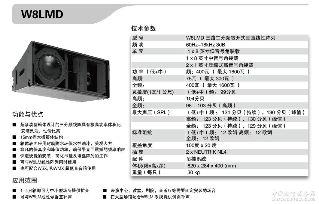 產品詳細介紹1-4只箱媽可為中小弄場所提供擴音,表演中心,教堂,劇院,音樂廳需要固定安裝的場合,可與W8LM線性做垂直補聲,在大型場館配合W8LM系統提供側面補聲。